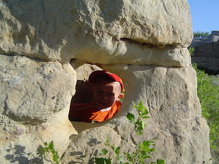 We went on a hike with Grampie and Sadie (the dog) Sunday morning. Caden was a trooper but he got tired out on the way back. Jim (Grampie) carried little Cayleigh up the rocks in her stroller and he put her to sleep. Caden took the picture of me by the rocks all by himself. ;)